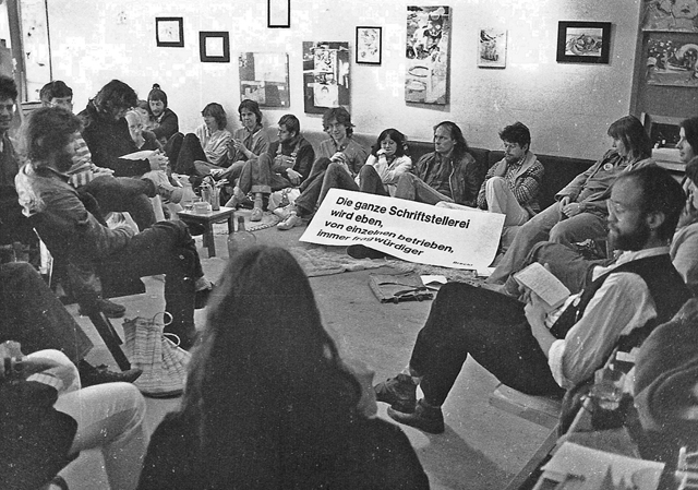 Auf dem Literaturfestival in Berlin mit lauter Promis von Rühmkorf bis Grass, wozu ich auch eingeladen wurde, ärgerte ich mich, dass die meisten Schriftsteller es nicht nötig hatten, am Publikumsgespräch teilzunehmen, und das Publikum untereinander abwerteten. Ich lud mit einem Flugblatt Schreibende auf dem Rasen zu einer Rundumlesung ein: Wer liest, schreibt auch (auf). Und wo ist diese Literatur? Fällt sie unter den Tisch? In die Schublade? Wollen wir sie mal auf den Tisch legen? Kein Platz? Warum nicht? Anschließend besetzten wir die Bühne. Der Erste, den ich anstiftete zu lesen, war – ein Stotterer. Rühmkorf meinte zu mir, er fände gut, was ich mache. Aber er sagte es nicht laut. Neulich sprach mich einer von damals an. Der wurde und blieb durch das Erlebnis Schriftsteller. Aus einem Verlagsbrief an mich, ob ich ein Kinderbuch schreiben wolle, machte ich ein Flugblatt für jedermann: "Wollten Sie nicht immer schon ein Kinderbuch schreiben?" Die Gewerkschaftler waren entsetzt. Dicke Tapetenbücher beklebte ich mit den getippten oder handgeschriebenen Texten plus Absendern der Schreiber, schleppte sie mit mir mit und legte sie öffentlich aus auf Veranstaltungen, auch vom Schriftstellerverband, in dem ich ja war.