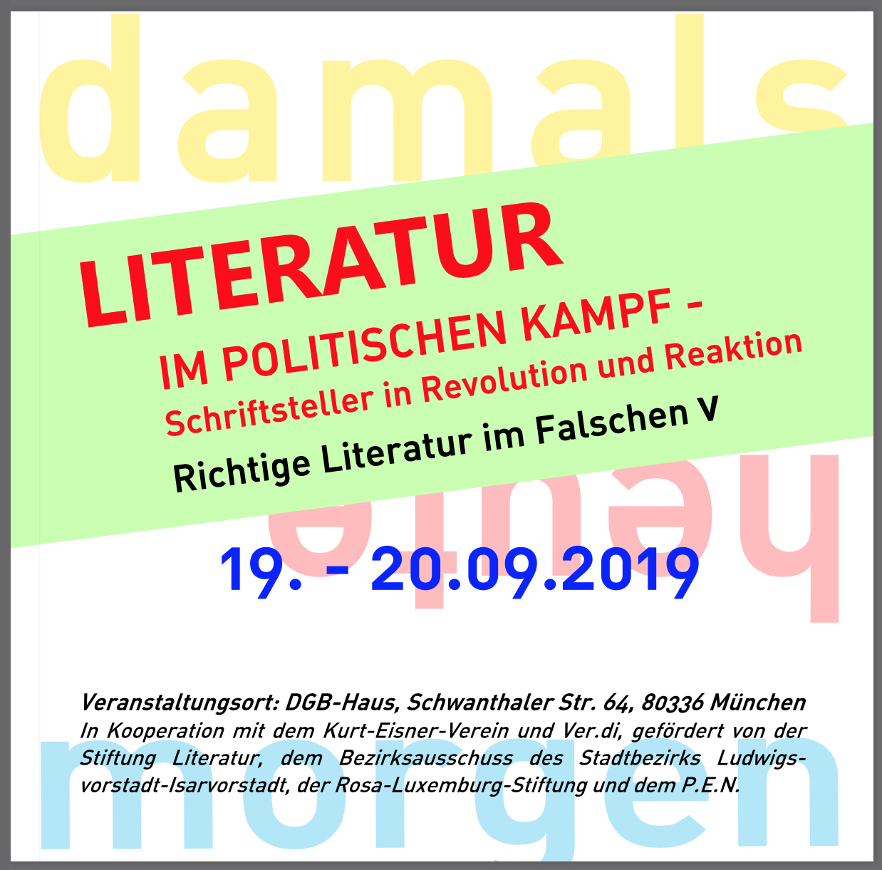 Es war kein guter Zeitpunkt für die fünfte, mit Unterstützung auch der Rosa-Luxemburg-Stiftung durchgeführte Tagung Richtige Literatur im Falschen (RLIF). Sie findet jährlich statt, zuerst 2015 im Brecht-Haus in Berlin mit im Verbrecher Verlag erschienenem Dokumentationsband. 2019 traf man sich in München, im DGB-Haus. Knapp drei Wochen zuvor waren die Wahlen in Sachsen und Brandenburg für Die Linke krachend verloren gegangen, während die AfD triumphierte. Die Wahl in Thüringen stand noch aus, doch wohl niemand wagte zu glauben, Bodo Ramelow könne die reißende Talfahrt bremsen. Mit 'Literatur im politischen Kampf - Schriftsteller in Revolution und Reaktion' knüpfte die Tagung an das 2018/19 vielfach begangene Gedenken an Revolution und Räterepublik in Bayern 1918/19 an, kam über weite Strecken aber matt, fast lustlos daher. Das lag auch daran, dass der wohl von der Luxemburg-Stiftung geförderte wissenschaftliche Nachwuchs fast durchweg ermüdend akademische Vorträge gehalten und selbst spannende Themen unter quälendem Jargon begraben hat. Auf dieser Tagung geht es um Literatur als Waffe, hätte ich den allzu brav-beflissenen Jungwissenschaftlern mitunter zurufen mögen, nicht als Schlaftablette! Wendet euch an Menschen, nicht an Germanisten! Aber auch manches Referat von Mitgliedern der 'Kerngruppe' des 'RLIF-Netzwerks' war ermüdend. Viele Politbürositzungen dürften kaum öder gewesen sein, musste ich denken, während manch uninspirierter Vortrag zumal von Männern, die sich allzu gern reden hörten, meine Schmerzgrenzen auslotete. Überdies war es in den anderthalb Tagen nicht möglich, die marode Lautsprechertechnik so weit instandzusetzen, dass einem nicht alle Viertelstunde Rückkopplungen in die Ohren fuhren. Wer gehört werden will, dem sollte daran gelegen sein, gut gehört zu werden.