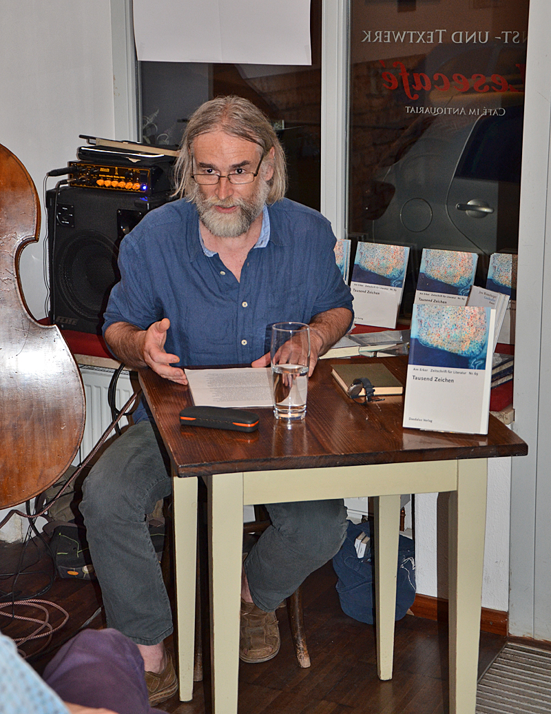Am Erker 69 ("Tausend Zeichen") wurde in München vorgestellt, am altvertrauten Veranstaltungsort, im Lesecafé der Buchhandlung Kunst- und Textwerk in der Ligsalzstraße 13. Es lasen Gerhard Lassen und Erker-Stammautorin Doris Weininger (beide aus München) sowie Jens Wonneberger aus Dresden, der mit Goetheallee letztes Jahr erneut einen wunderbaren Stadtschweifer-Roman vorgelegt hat. Musikalische Begleitung: St. Müller am Kontrabass. Moderation: Andreas Heckmann.