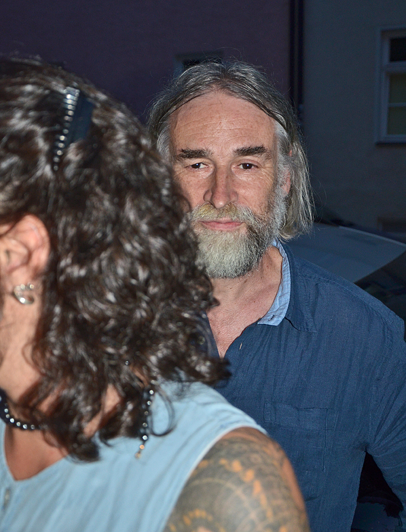- Jens Wonneberger vor dem Café und zwischen zwei Gästen