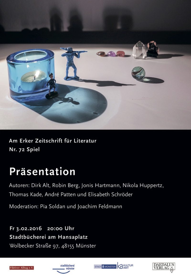 Im Dezember 2016 erschien Am Erker 72. 40 Texte von 32 Autorinnen und Autoren klopfen die unterschiedlichen Facetten des Themas "Spiel" ab. Subtile Narrenspiele stehen neben kindlichen Rollenspielen, der Wettkampf des Sportlers um den Sieg neben dem Ringen um Anerkennung des Kleinkünstlers.