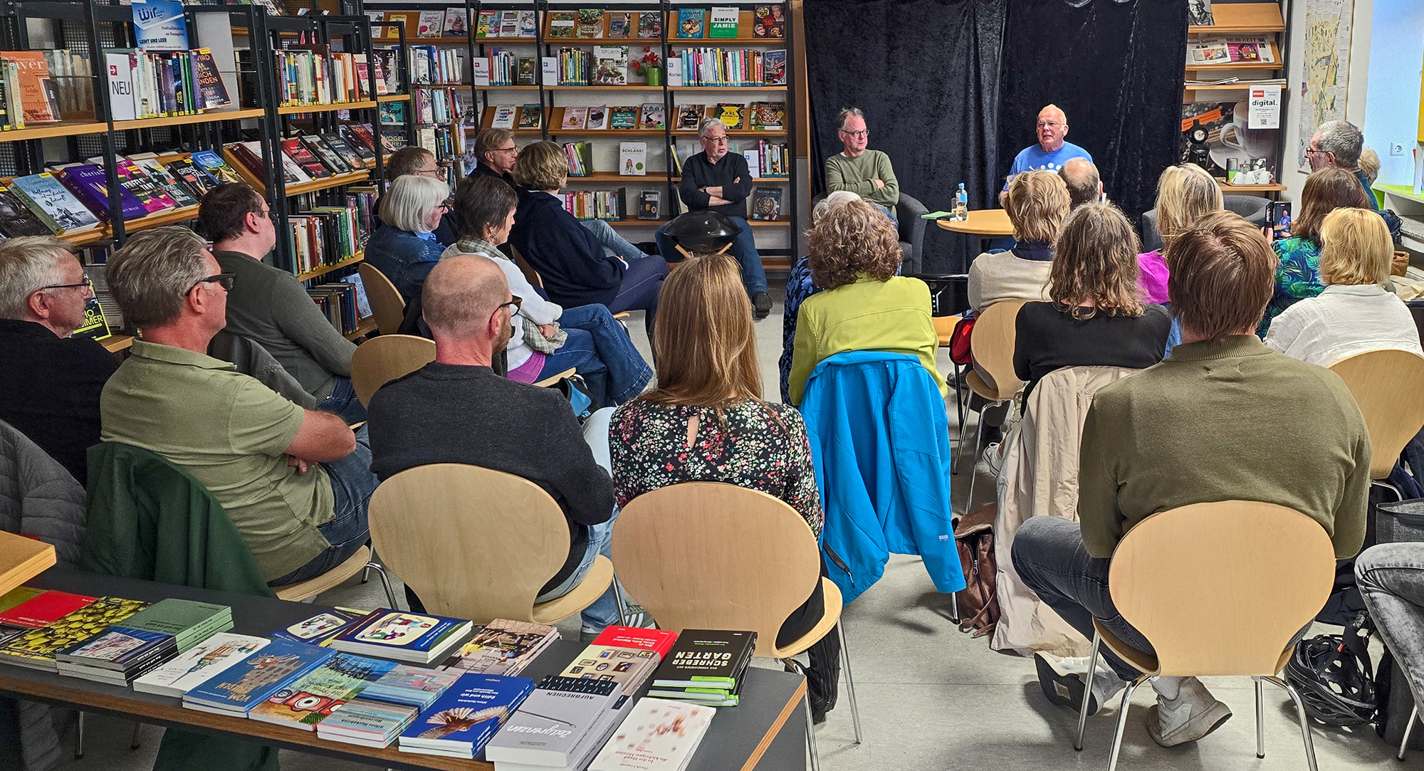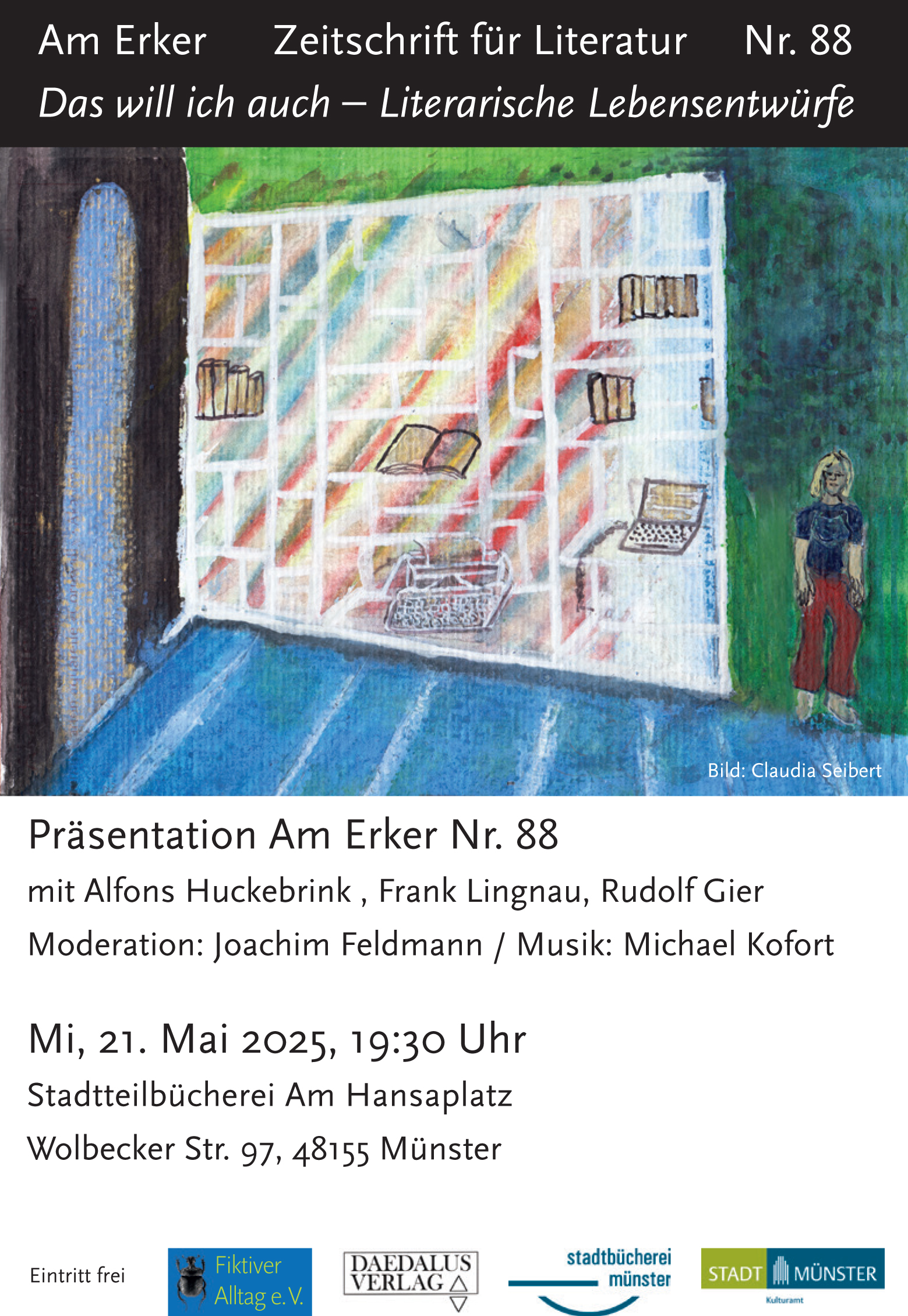 Vor vollem Haus wurde in der Bücherei am Hansaplatz die neue Ausgabe von Am Erker der Öffentlichkeit präsentiert. Einblicke in ihre schriftstellerische Frühzeit gaben die Autoren Frank Lingnau, Alfons Huckebrink und Rudolf Gier-Seibert. Joachim Feldmann moderierte und las außerdem einen Beitrag des Am-Erker-Kolumnisten Fritz Müller-Zech über die Anfänge der Zeitschrift vor fast einem halben Jahrhundert in der münsterländischen Kleinstadt Emsdetten.