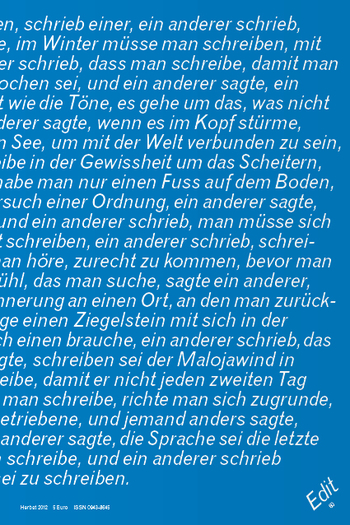 Manchmal agiert man glücklos und verpasst selbst den letzten Bummelzug, dann wieder gelingt alles, als wäre man mit der Magie im Bunde. So eine Zeit erlebt gegenwärtig die Leipziger Edit, und natürlich verdankt sie das nicht der Zaubermacht der Redakteure Jörn Dege und Mathias Zeiske, sondern deren Ingenium - und dem guten Ruf der Zeitschrift, die sich, wie die Ausgaben 60 und 61 zeigen, vor tollen Texten kaum retten kann. Jan Snela, *1980 und 2010 beim Open Mike erfolgreich, schreibt mit "Das Kind" hochinspirierte Prosa. Sein Kind ist so allein wie in Büchners Märchen und hat's auch so schwer, nur dass das Drama in der Vorstadt spielt. Aber die Sätze! Wie die sitzen! "Zu Mittag gibt's wieder Ferkel und ein paar Blaukrautreste, den Matsch der Knödel." - "Nur leicht ein Wind weht, als das Kind tags drauf losfährt." - "Es steht ein Mann dort, der ein Jackett trägt, das grau meliert ist." Doch Arno Carmenisch (*1978 in Graubünden) kann mithalten mit seiner Kurzprosa "Und man schreibt", die in weißen Lettern den Weg aufs himmelblaue Cover fand. Auf einer halben Seite musiziert er virtuos und setzt den Bogen nach zwei Minuten bescheiden wieder ab: "Schreiben sei dubioser als Schädel auskochen, schrieb einer, ein anderer schrieb, dass man ja nicht im Frühling schreiben solle, im Winter müsse man schreiben, mit warmen Füßen und kühlem Kopf, ein anderer schrieb, dass man schreibe, damit man nicht vergesse, aus welchem Loch man gekrochen sei, und ein anderer sagte, ein guter Musiker spiele die Pausen genau so gut wie die Töne, es gehe um das, was nicht sei, im Nichts stecke der Groove, und ein anderer sagte, wenn es im Kopf stürme, gehe er zum See und stecke den Finger in den See, um mit der Welt verbunden zu sein, das helfe." Aber damit nicht genug: Edit 60 bringt auch "Mr. Lytle" aus John Jeremiah Sullivans Essayband Pulphead. Vom Ende Amerikas. Der Ich-Erzähler berichtet aus der Zeit, als er - blutjunger Literat und Studienabbrecher - Gesellschafter und Pfleger des 90-jährigen Südstaaten-Autors Andrew Nelson Lytle war. Der verschlungene, hochartistische Text ist ein Porträt des alten, unter der Hand aber auch des jungen Mannes und eine minutiöse Beschreibung von Einsamkeit und Verfall, in der das Gefühl des Eingeschlossenseins (im Lebenswerk, im Haus, im alten, immer unzulänglicher werdenden Körper) ungemein plastisch wird. Und dann kommt auch noch Kevin Vennemann und schreibt mit vielen Vor- und Rücksprüngen "1966", ein kunstgeschichtlich wie literarisch versiertes Porträt von Eva Hesse (nicht der Pound-Übersetzerin, sondern der New Yorker Künstlerin, die 1970 jung starbZwar gelang es auch in der Print-Ausgabe, die bildende Künstlerin Eva Hesse von der gleichnamigen Übersetzerin zu scheiden, doch die firmiert dort als Proust-Übersetzerin - ein ärgerlicher Fauxpas, den ich kurz nach der Drucklegung des Heftes bemerkte und nur noch im Netz korrigieren konnte. Die schriftbildliche Nähe von Proust zu Pound, die Tatsache, dass auch die lange Zeit kanonische Proust-Übertragung von einer Eva stammt (von Eva Rechel-Mertens nämlich), und der Umstand, dass es an dieser Stelle gar nicht ums Übersetzen ging, haben meinen Schnitzer sicher begünstigt. Mag die Fehlerursache auch klar sein: Da ich selbst literarischer Übersetzer aus dem Englischen bin, schmerzt mich der Lapsus umso mehr, und ich möchte mich darum bei Proust, Pound, Eva Hesse, Eva Rechel-Mertens, meiner Zunft und meinen Lesern entschuldigen.), das mir Werk, Person und Umfeld so lebendig werden ließ, dass ich anschließend lange dazu im Netz recherchierte.