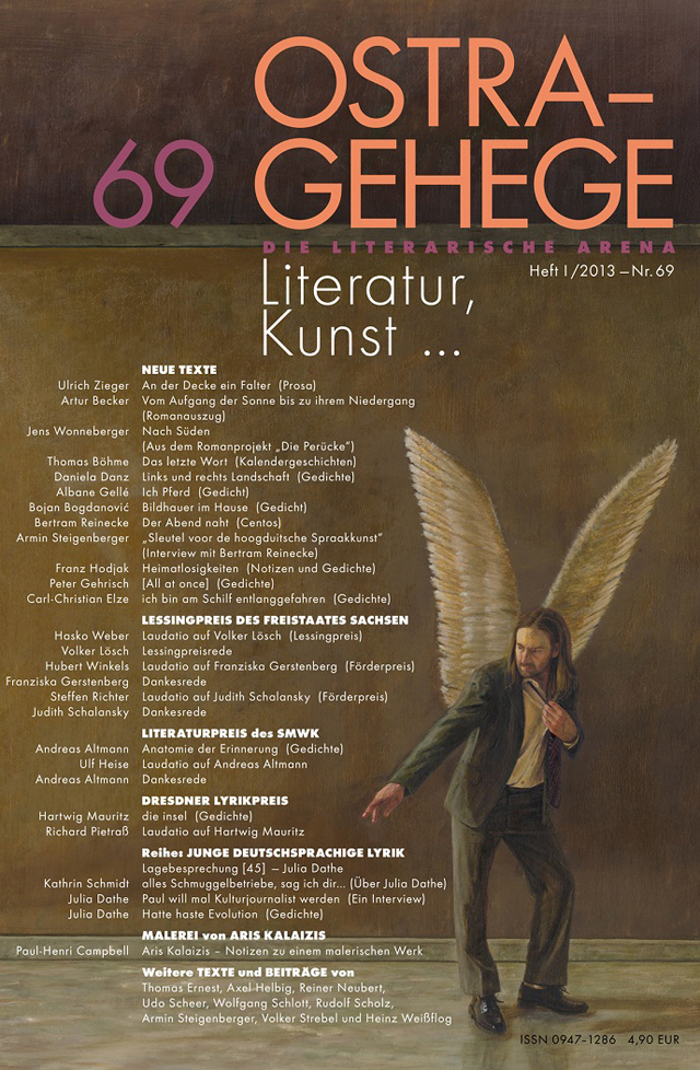 Jens Wonneberger läuft dann zu großer Form auf, wenn er sein tief melancholisches Weltverhältnis in Geschichten gießt, deren Schwermut etwas Beiläufiges hat und den Text doch durchtränkt. Bestens ist das in "Ums Karree" gelungen, stillen Erkundungsgängen durchs eigene Viertel und damit auch Streifzügen durch die (Gefühls)Geschichte des Erzählers. Es wäre - hallo, Steidl? - dringend zu wünschen, dass dieses 2001 mit dem Konkurs des Kowalke-Verlags untergegangene Buch wiederveröffentlicht wird und endlich die Aufmerksamkeit bekommt, die es verdient. Auch "Nach Süden" - im 69. Ostragehege als Auszug aus einem Romanprojekt annonciert, aber so dicht, dass jede Einbettung überflüssig, ja, störend erscheint - bringt alle Mollqualitäten des Dresdener Autors einwärts gekehrt zum Funkeln: Ein Paar (die Ehe ist gescheitert, die Beziehung aber noch nicht beendet) unterbricht seine Fahrt in den Süden bei dichtem Novembernebel, übernachtet in einem leicht unheimlichen Dorfgasthof und setzt die hoffnungslose Reise am nächsten Morgen fort. Da ist viel Platz für schöne Sätze wie: "Der Nebel des Vortages war verschwunden, es war kalt, die Kastanie im Hof war von Raureif überzogen, an einem der schwarz ausladenden Äste hing eine Schaukel, deren Ketten in der Morgensonne glitzerten." Mit Literaturzeitschriften im Magazinformat - dazu gehört Ostragehege - fremdelt der Rezensent ein wenig, weil Prosa im Zweispaltendruck nicht gut aufgehoben, einspaltig aber auf (annähernd) A4 strapaziös zu lesen ist. Gedichte dagegen verlieren sich auf großen Seiten oder treten, gerade damit sie sich nicht verlieren, oft allzu gedrängt auf. Für Rezensionen und Interviews, für tendenziell journalistische Formen also, ist das Format mit seinen Zweispaltern zwar geeigneter, aber auch auf A5 machen sich Zweispalter gut. Ob aber quadratisch, hochkant oder rund: Allzu viele Lob- und Dankesreden tun keiner Zeitschrift wohl. In dieser Ausgabe sind ihnen 21 von 84 Seiten vorbehalten, mithin ein volles Viertel. Da mögen die Laudatoren noch so klug rühmen und die Geehrten noch so würdig sein - die Diagnose lautet: panegyrischer Overkill. Erfrischend heiter dagegen, ja, tänzelnd tritt Thomas Böhme den Lesern des Ostrageheges mit 14 Kalendergeschichten entgegen, die ihn einmal mehr als Meister des Kurzprosa-Impromptus zeigen, etwa in "Masken": "Als er sein, wie er glaubte, letztes epochales Epos begann, legte der vielfach geadelte Dichter alle Masken ab, die er im Laufe seines Lebens angenommen hatte - die Maske des treusorgenden Familienvaters und Gatten, die des Lebemannes und Frauenflüsterers, die Maske des Gewissens der Nation und die des Bewahrers der Schöpfung. Nur die Maske des Jungen, der ein Held sein wollte und doch regelmäßig Fersengeld gab, wenn die Wolfskinder hinterm Wartehäuschen auf ihn lauerten, diese Maske war er nicht losgeworden. Hasenzähnig und mit glühenden Segelohren saß er vorm leeren Bildschirm, und endlich tippte er seinen ersten aufrichtigen Satz: 'Im Anfang war die Angst, und die Angst war bei ihm, solange er denken konnte.'"